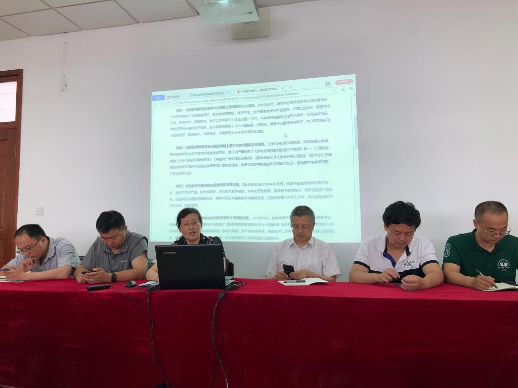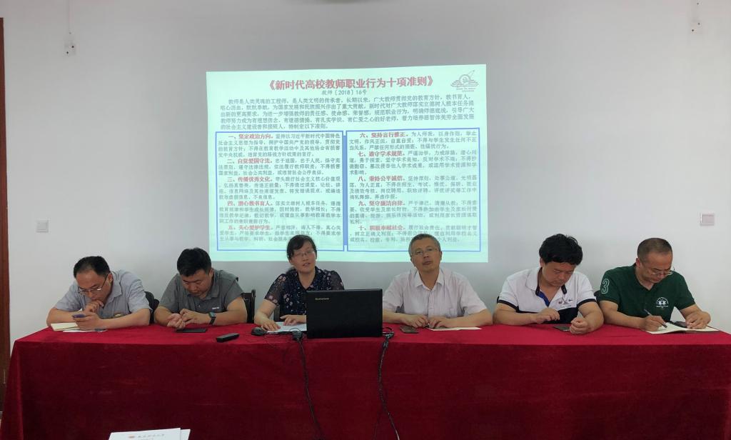 2021年6月9日下午,信息工程学院在德业楼406会议室举行“学党史、明师德、正师风” 专题教育。会议结合党史学习对师德专题教育进行了动员,对《新时代高校教师职业行为十项准则》做了宣传解读,并结合教育部“违反高校教师职业行为十项准则典型案例”开展了师德警示教育。全体教职工参加了会议,签订了《廉洁从教承诺书》。
