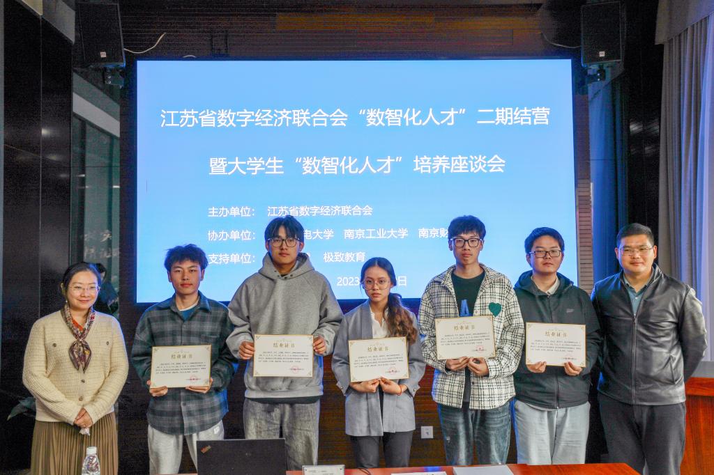 活动中,李慕原副处长和马健副书记为我校参加“数智化人才”二期公益培训班的学生颁发结业证书。在座谈交流环节,李慕原副处长和马健副书记分别介绍了学校基本情况、信息工程学院专业设置、人才培养以及校企合作开展情况,并与江苏省数字经济联合会秘书长李敏闪、南京科远智慧科技集团股份有限公司副总裁沈德明以及南京邮电大学、南京工业大学相关部门、院系负责人一道就“数智化人才”培养展开交流探讨。大家认为,数字化领导力是未来人才核心竞争力,数智化转型是新生代企业成长发展的重要路径,同时也是高校人才培养的重要渠道,校企双方应当优势互补、资源共享,深度产教融合,搭建教育新平台,共同为培养具有创新能力的数智化人才贡献力量。