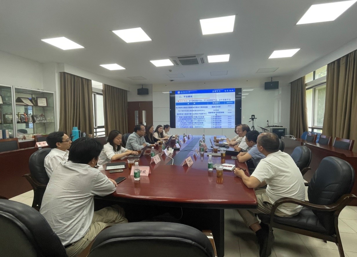 黄健院长一行首先来到东华大学计算机科学与技术学院座谈,会议由东华大学计算机科学与技术学院院长方志军主持,副院长常姗、计算机软件与理论系主任卢婷、学院产学研协同创新事务中心副主任罗辛等参加座谈交流。副院长常姗全面介绍了本学院的发展历程、师资力量、学科建设、科研成果等,我院院长黄健也简要介绍了我院的基础情况。座谈会就“科研平台建设”、“人才培养模式创新”、“产学研深度融合”、“实验室建设”等进行了深入的交流和探讨。通过此次调研,两院能够开启更深层次的合作交流,共同推动平台和科研合作发展的强烈意愿,双方今后可以从电子商务平台与纺织服装、粮食大数据等方面加强合作。