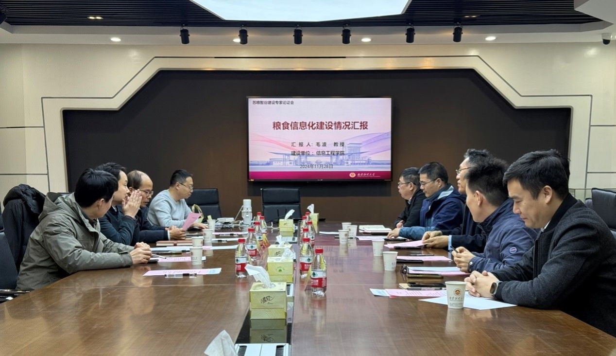 为推进苏粮智谷高水平社会服务平台建设,切实增强粮食信息化科技创新能力,发挥苏粮智谷在江苏“科技兴粮兴储”方面的重要引领示范作用,11月28日上午,苏粮智谷建设专家论证会在南京财经大学仙林校区德业楼211会议室召开。我院特邀来自江苏省粮食集团、南粮集团、无锡中粮工科、苏州苏垦现代农业发展有限公司、中储粮江苏质检中心、江苏有线数据网络有限责任公司等单位的专家对苏粮智谷建设情况进行专业指导和论证把关。校科研院院长方勇、食品科学与工程学院院长唐培安、信息工程学院院长黄健、信息工程学院院长助理毛波、食品科学与工程学院教授万忠民等参加会议。