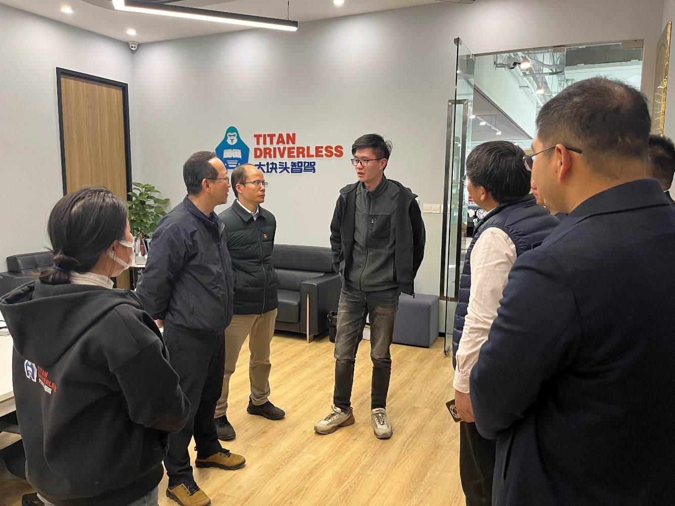 随后,学院领导一行在赵元岭副部长带领下参观了新加坡·南京生态科技岛展厅并前往南京大块头科技有限公司、江苏未来都市出行科技集团有限公司、南京土星信息科技有限公司开展访企拓岗促就业行动。在南京大块头科技有限公司,公司负责人李华芹详细介绍了公司聚焦港口散货码头、矿山、干线物流等特定场景重载运输的自动驾驶系统研发情况;在江苏未来都市出行科技集团有限公司,李红云总经理带领学院领导一行体验了公司研发的无人驾驶小巴车并介绍了公司以数据驱动打造新型公交都市的发展规划;在南京土星信息科技有限公司展厅,总经办负责人刘永红详细介绍公司在产品研发、科技创新、知识产权保护等方面情况。在走访交流中,学院领导与相关企业负责人进行深入交流,介绍学院的学科专业建设、科研工作以及人才培养情况,并就校企双方在产学研、学生就业实习实践等方面达成合作意向。
