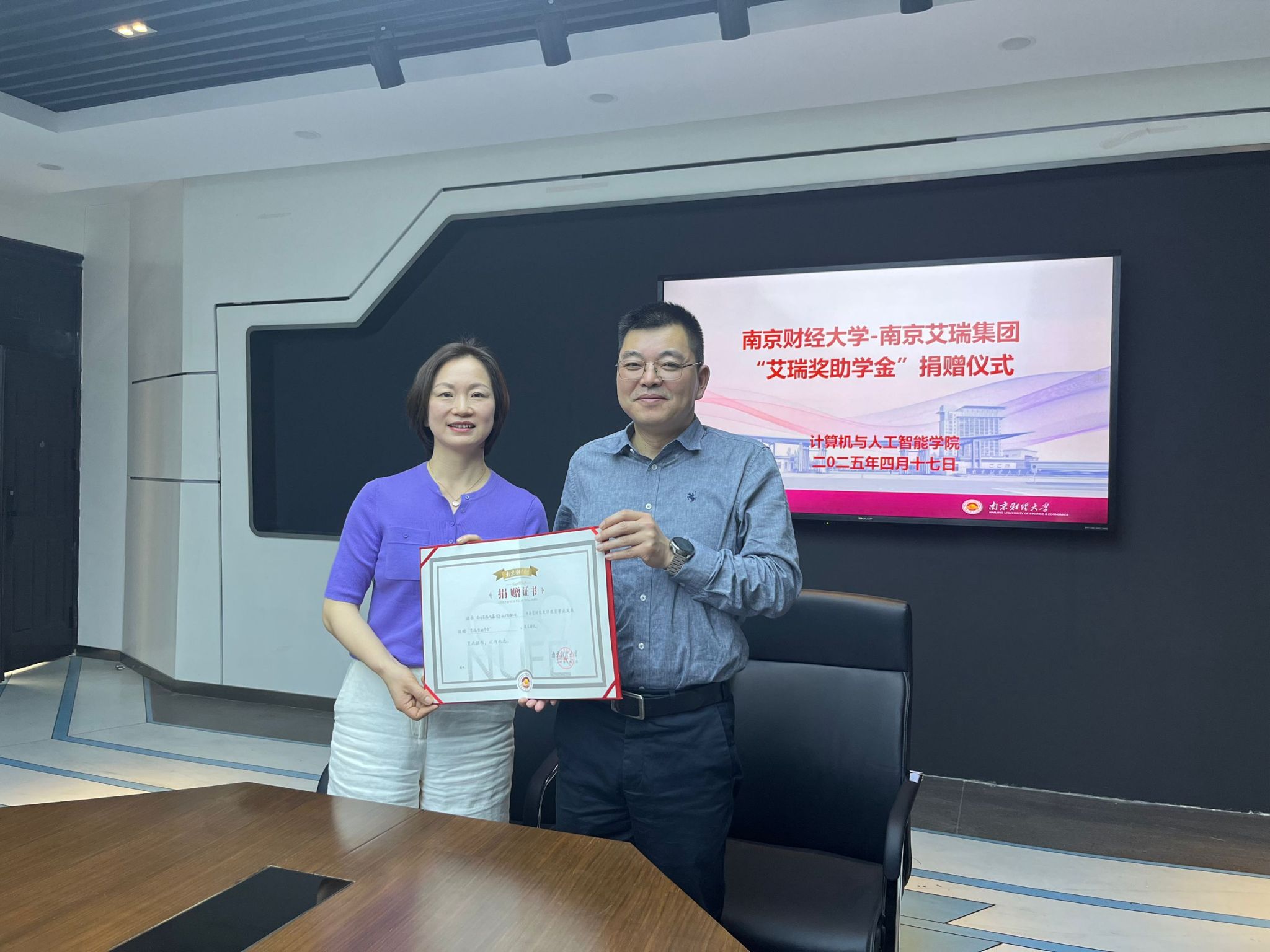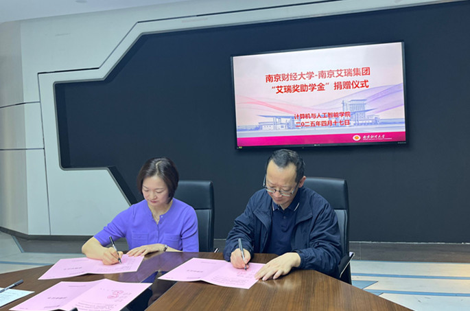 为助力学生学业发展,深化校企合作,4月17日下午,计算机与人工智能学院在仙林校区德业楼Z4-211会议室举行“艾瑞奖助学金”捐赠签约仪式。南京艾瑞集团董事长杨利霞、总经理徐彬、市场总监陈韩、项目专员谢馨瑶,南京财经大学对外联络处处长陆明峰、副处长裴银伟,以及计算机与人工智能学院领导和师生代表参加了捐赠签约仪式。仪式由计算机与人工智能学院党委副书记马健主持。