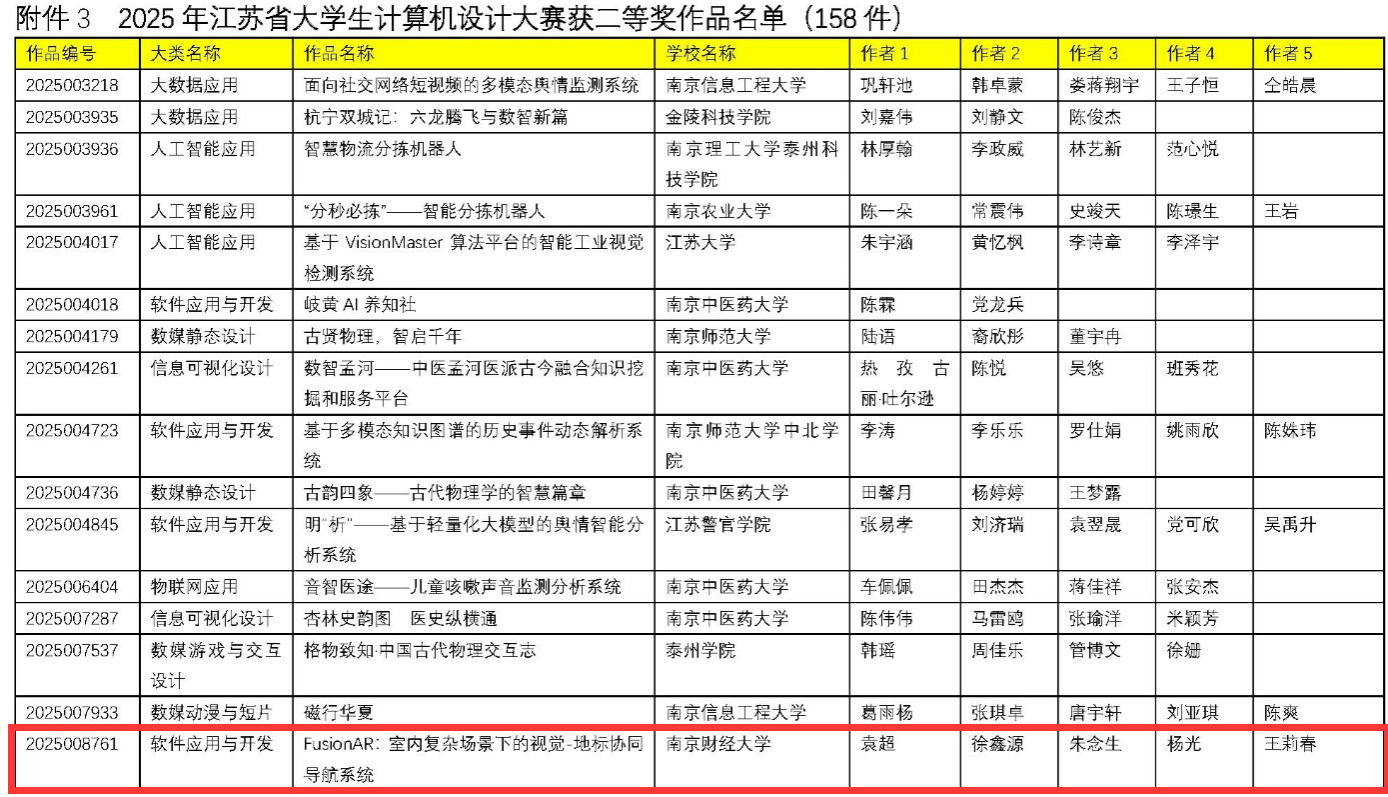 袁超、徐鑫源、朱念生、杨光、王莉春同学的《FusionAR:室内复杂场景下的视觉﹣地标协同导航系统》(指导老师:朱利涛)项目斩获二等奖,晋级国赛;王方胜、李俊俐、王欣怡同学的《舆情之眼——基于大语言模型的南京景点舆情分析系统》(指导老师:朱桂祥)、代英瑾、张黄倩、杨迪越、胡晏子同学设计的《AI就业市场全景洞察:大数据视角下的人才供需分析与战略应对》(指导老师:蒋伟伟)、 叶灏、杨嘉成、何佳文、杨一帆同学创作的《智绘旅程》(指导老师:李树青)获得三等奖。这些作品选题新颖,紧密结合人工智能、大数据等前沿技术,展现了解决实际问题的创新思路,充分体现了我院学生扎实的专业知识、良好的创新能力和实践动手能力。