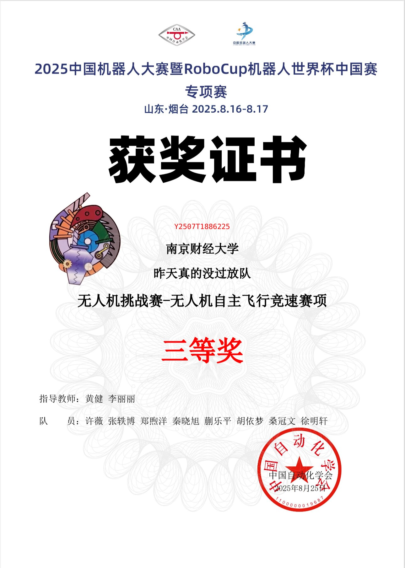近日,2025年中国机器人大赛暨RoboCup机器人世界杯中国赛专项赛在山东烟台举行。由我院张轶博、郑煦洋、许薇、刘曾祥、齐子峻组成的“专业修车”队在指导老师章磊的精心指导下,经过激烈角逐,斩获工程竞技类机器人-车型智能搬运赛一等奖;由许薇、张轶博、郑煦洋、秦晓旭、蒯乐平、胡依梦、桑冠文、徐明轩组成的“昨天真的没过放”队在指导老师黄健、李丽丽的精心指导下,斩获无人机挑战赛——无人机自主飞行竞速赛项三等奖。
