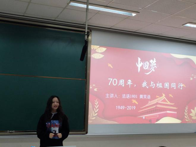 首先,黄笑语同学通过1949年与2019年的阅兵仪式对比视频,以直观的方式展现了我国经过70年的发展所取得的辉煌成就。接着在现场同学强烈的热情邀请下黄笑语同学又分享了自己与朋友们观看阅兵的感触。同学们也积极发言,现场氛围相当活跃。