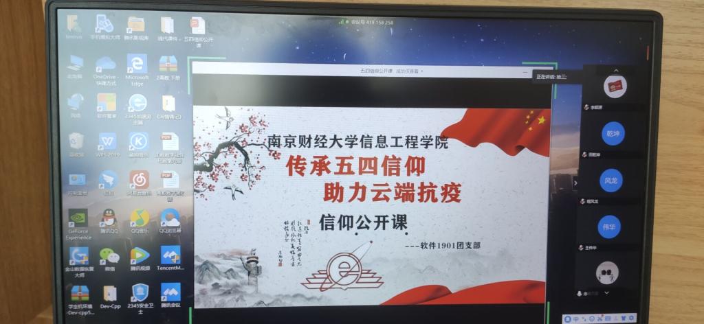 4月25日至4月28日,我院各团支部利用钉钉直播,QQ课堂,腾讯课堂等平台认真学习习近平总书记给北京援鄂医疗队全体“90后”党员的回信精神,在线上开展“传承五四信仰,助力云端战疫”信仰公开课,全院大一至大三以及研究生共有17个团支部参加。活动包括三项内容:一是由各团总支书记主持,全面介绍本次主题团日活动的重要意义;二是微团课,观看武汉战“疫”纪录片,习近平总书记给北京大学援鄂医疗队全体“90后”党员的重要回信,重温习近平总书记“4·19”重要讲话 打好互联网战“疫”;三是团员代表分享活动感悟和奋斗目标。