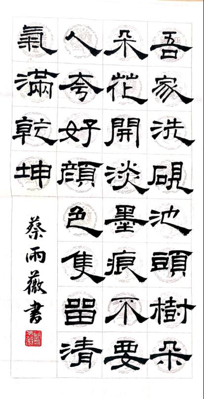 此次活动冠军物联网2001班蔡雨薇同学提交了古诗《墨梅》以及楷书所作的对联两份作品。薄薄的宣纸上行云流水、落笔如云烟,宛如诗中所描绘的墨梅“不要人夸颜色好,只留清气满乾坤”,朴实无华而兼纳乾坤;而楷书作品又换了一个风格,对联对仗工整,力透纸背,刚劲的文字透露出廉洁的神韵,清正廉洁的品格仿佛笔直的墨线,严肃而庄重。
