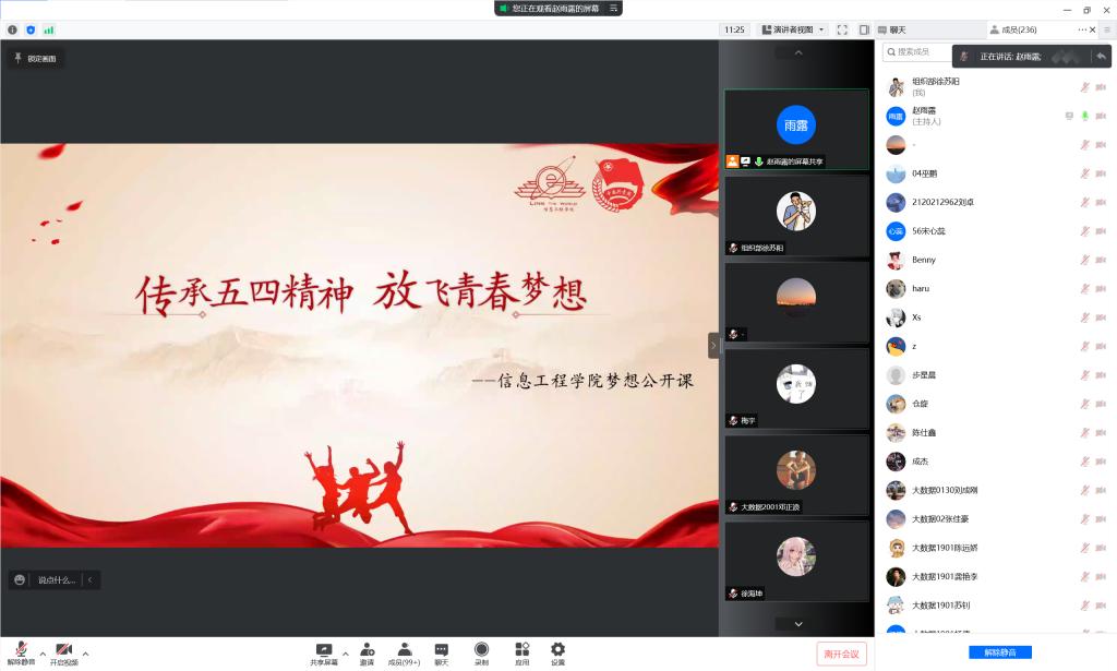 “青年是祖国的未来、民族的希望,也是我们党的未来和希望。”习近平总书记对青年大学生寄予厚望。4月7日晚,信息工程学院组织举办了以“传承五四精神,放飞青春梦想” 为主题的线上团课第二讲暨梦想公开课,引领信工青年强信念、跟党走,激励信工青年汲取前进的智慧、凝聚强大力量。学院2021级、2020级全体同学参加本次活动。