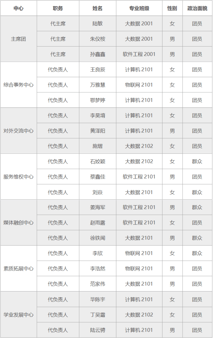 南京财经大学信息工程学院第十九届学生会于5月中下旬举行了中心负责人面试和第十九届学生会换届大会,经过严格的考核与筛选,确定了信息工程学院第二十届学生会代主席、代负责人人选,现予以公示:
