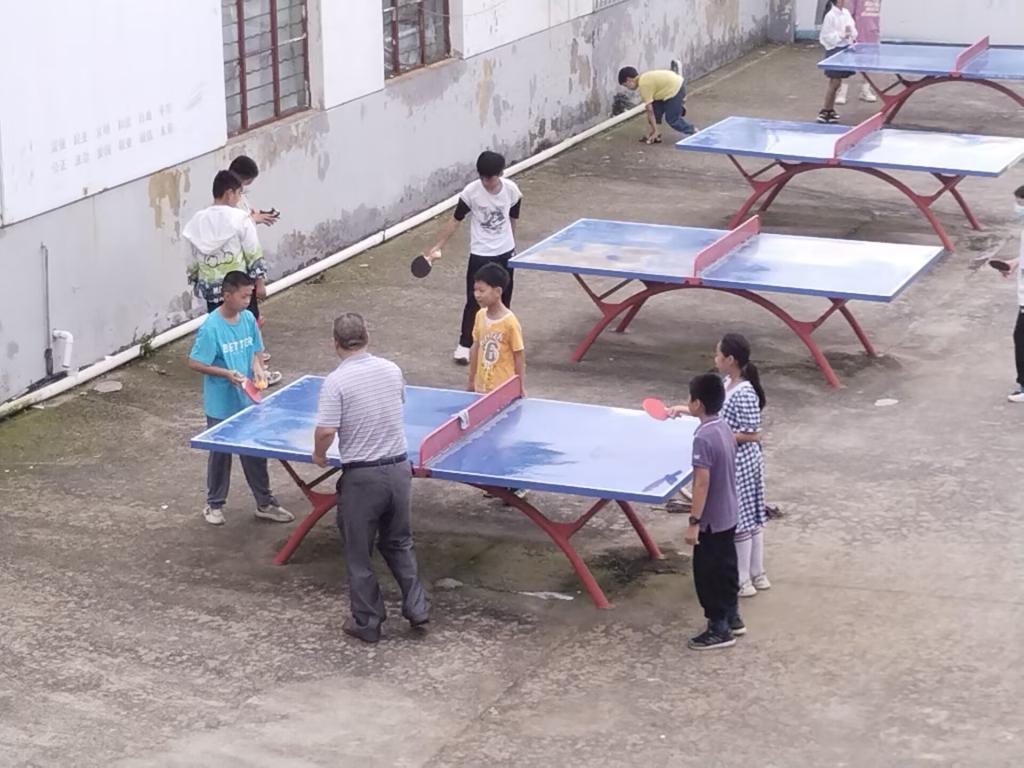 志愿者带领孩子们来到操场进行运动的选择以及学习。例如,选择乒乓球的学生拿着球拍在乒乓球桌边学习握拍姿势和传球动作,分组练习乒乓球单打技能。过程中志愿者们也认真观察,帮助纠正不到位的动作。