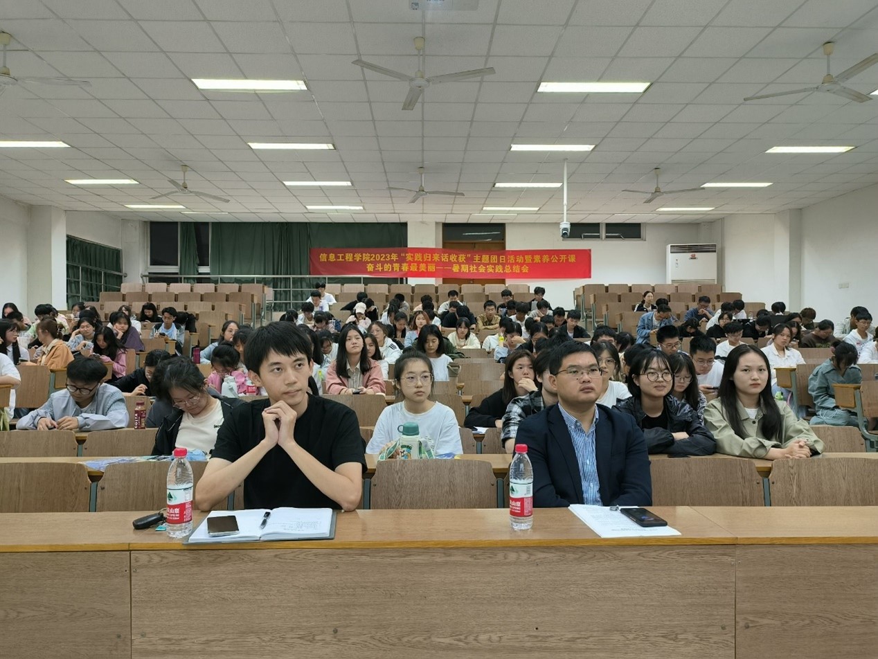 为选树典型,表彰先进,进一步巩固社会实践活动的成果,交流和推广活动中的先进经验,9月22日,信息工程学院在博观楼302举办2023年“实践归来话收获”主题团课、素养公开课暨“奋斗的青春最美丽”暑期社会实践总结表彰会。信息工程学院党委副书记马健、团委书记陈鑫出席会议,2023级同学参会。