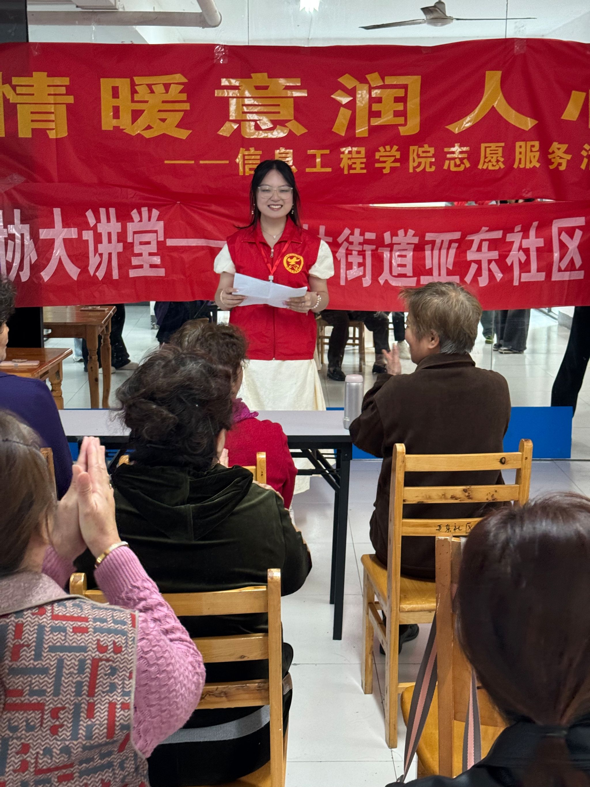 活动接近尾声,志愿者们积极协助敬老院负责人员安排老人们离场,并完成了现场的清扫工作。本次志愿服务活动不仅为老人们带去了温暖和欢乐,在社会和谐的乐章中,加入了信息工程学院学子的华彩,也让志愿者们切身体会到志愿服务的精神与意义,让大学生对特殊群体有更多的了解与关注,共同为老年人营造一个更加便捷、舒适的智能生活环境。