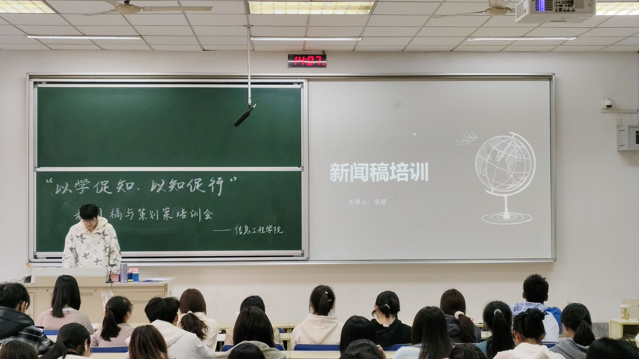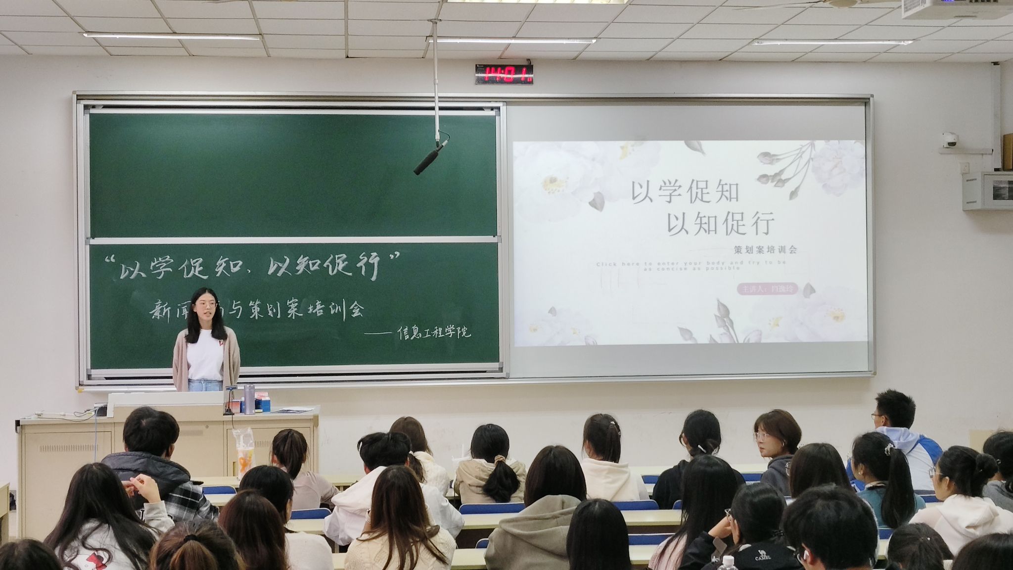 为培养新一届团学组织成员的活动新闻稿以及策划案撰写能力,规范写作格式,提高工作效率,信息工程学院于10月27日在专四111教室举办了以“以学促知,以知促行”为主题的新闻稿与策划案培训会。