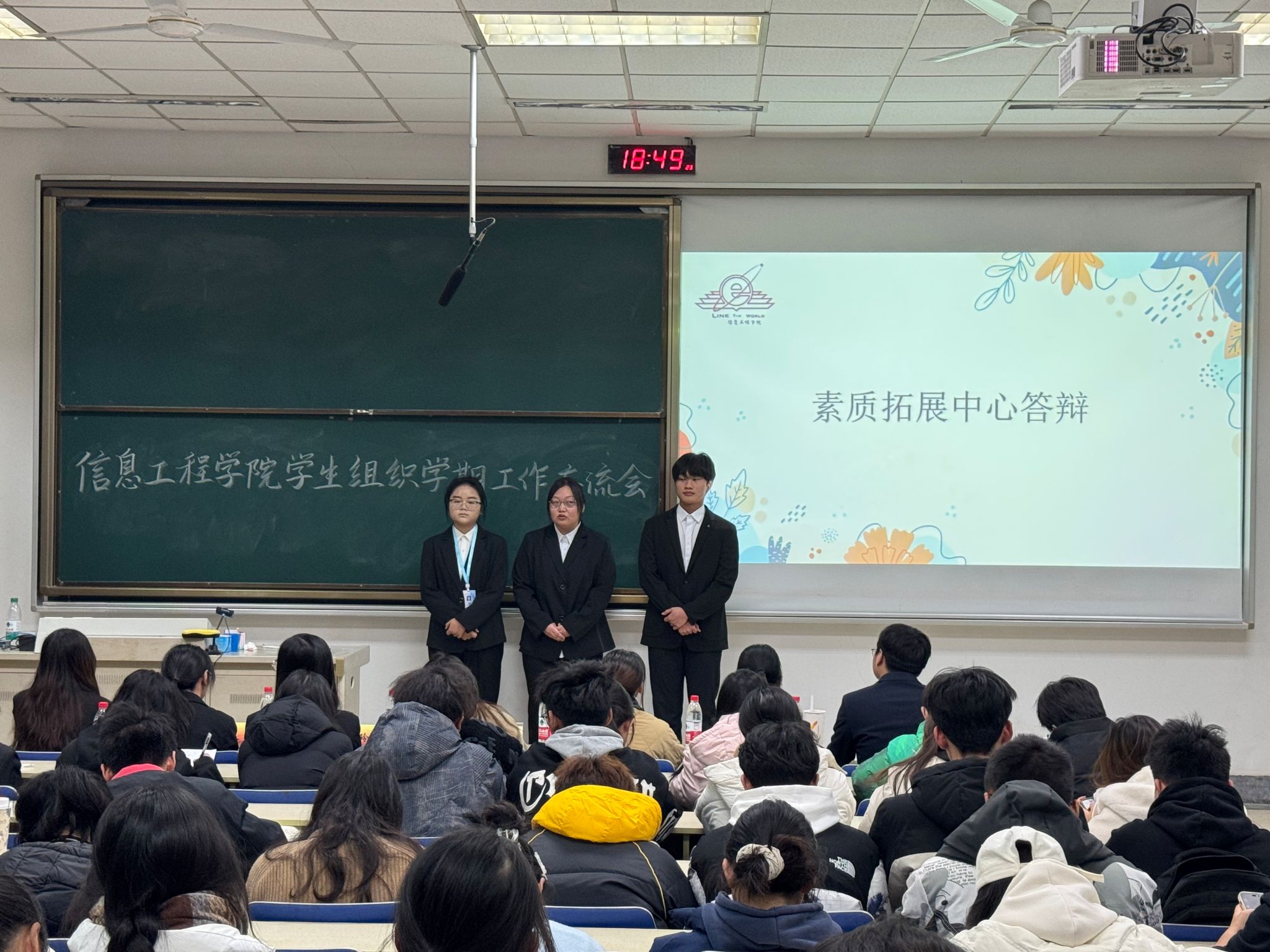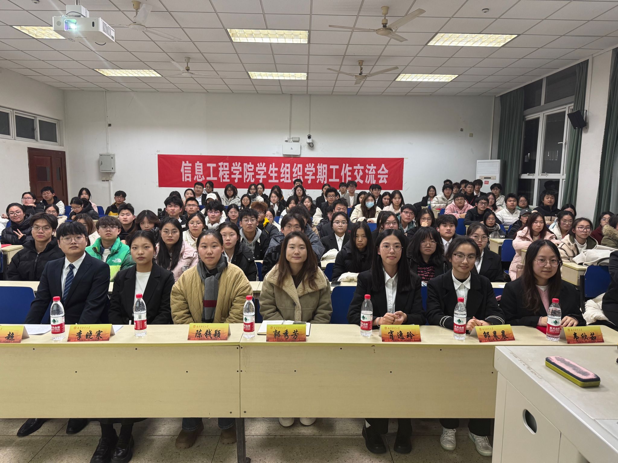 为总结本学期分团委、学生会工作情况,促进部门间工作交流,2024年12月9日,信息工程学院学生组织学期工作交流会于德业楼118教室举行。院团委书记郭秀芳老师、法学院学生会主席陈钱颖、信工院学生会主席肖逸玲、信工院学生会主席邵晨晨、信工院学生会主席韦欣茹、信工院团委副书记(学生)李晓寒、信工院团委副书记(学生)袁超、各班级代表及分团委、学生会全体成员参加会议。