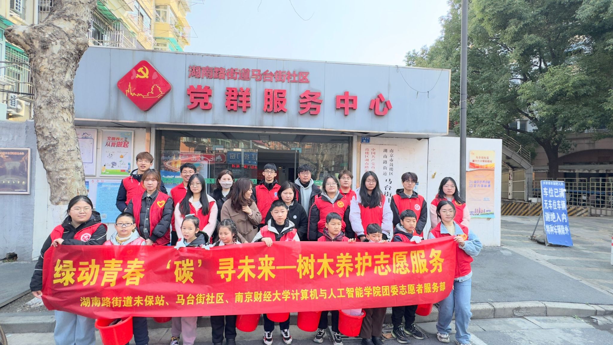 2025年3月16日,南京财经大学计算机与人工智能学院志愿者服务部与南京市鼓楼区湖南路街道马台街社区党群服务中心联合举办"绿动青春,碳寻未来"植树节主题公益活动。本次活动以家庭为单位组织,共吸引50余组亲子家庭参与,通过将树木养护实践与"3·15国际消费者权益日"、人工智能知识和反诈宣传相结合,为社区注入绿色发展活力与法治文明新风,获得社区居民广泛好评。