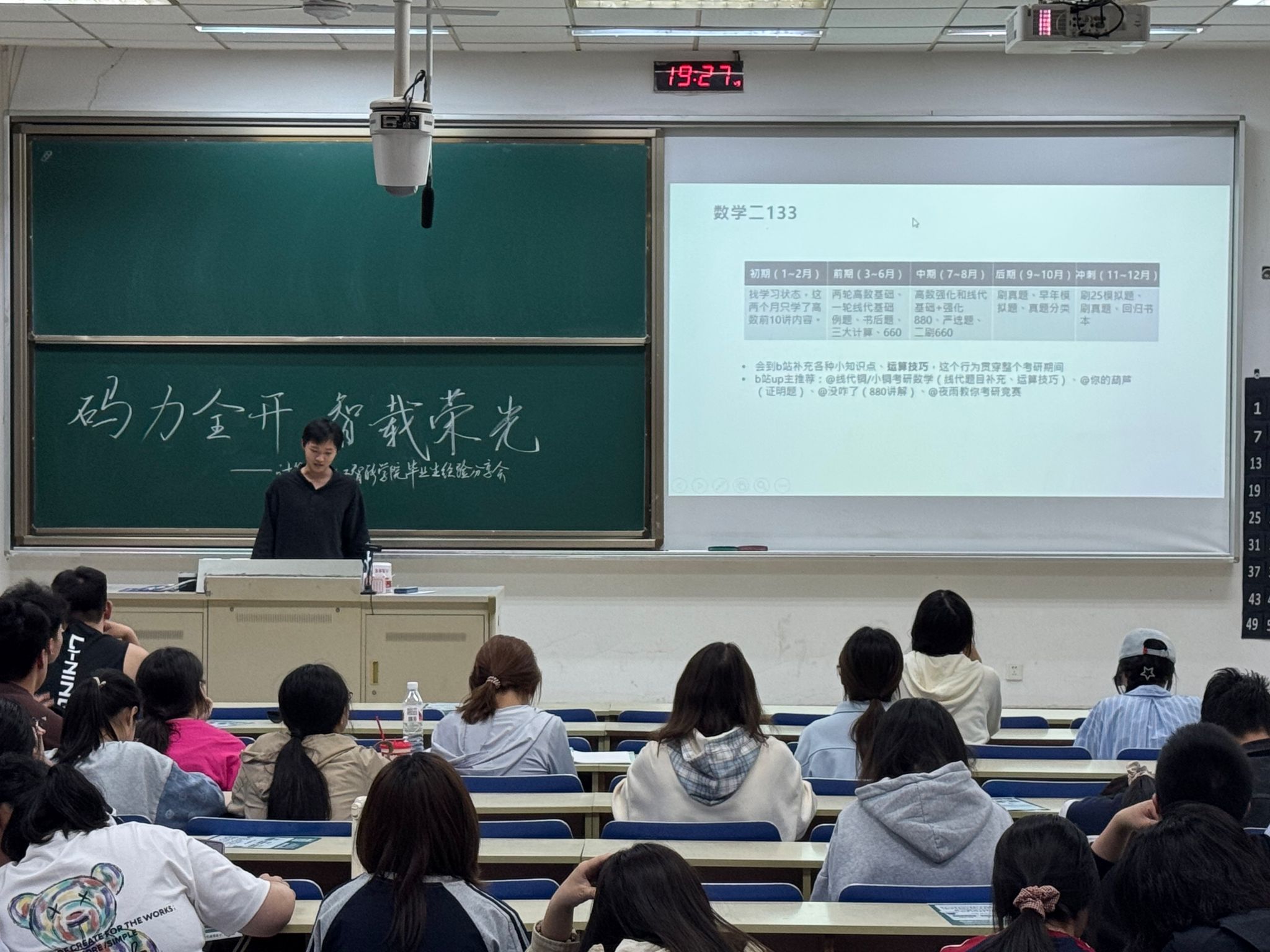 为加强职业生涯规划教育,助力学生把握职业发展关键节点,南京财经大学计算机与人工智能学院于2025年4月10日晚在德业楼101举办了“‘码’力全开,智载荣光”2025届毕业生经验分享会。本次活动特邀六位在公务员考试、研究生考试及海外留学领域表现卓越的毕业生代表,通过现身说法为学弟学妹们传授实战经验,助力同学们做出更明智的人生选择。