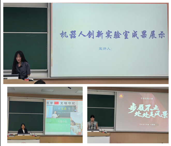 最后,我院邀请了三组优秀团队——机器人创新实验室、“豫你偕行,烛光辉映”支教团队以及皖南古村探索实践队,为大家分享实践经验。机器人创新实验室蒯乐平分享了他们在暑期社会实践中的创新成果和技术挑战。通过图片和视频,向同学们展示了极具学院特色的实践成果。“豫你偕行,烛光辉映”支教团队队长薛怡宁简单介绍了整个项目的基本情况,重点分享了支教过程中丰富多彩的课程活动内容,并鼓励同学们积极投身暑期社会实践的支教活动,为乡村振兴贡献青年力量。皖南古村探索实践队马菁鹤同学先向同学们展示了他们团队取得的突出的实践成果,然后从前期准备、中期纪实、后期总结三个方面向同学们介绍了他们在暑期社会实践过程中的主要工作,激发了同学们深入基层实践的热情。
