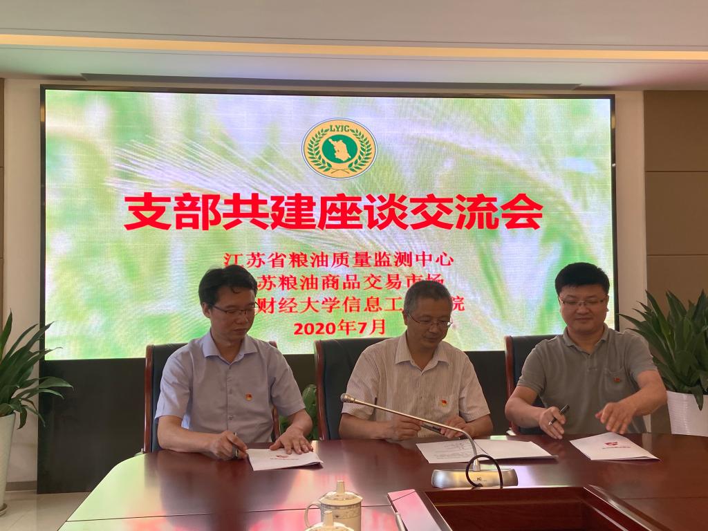 交流会后,信息工程学院院长、电子商务实验室党支部书记曹杰与江苏粮油质量监测中心支部书记黄熙荣、江苏粮油商品交易市场支部书记高巍现场签订了“党建共建”协议。此次活动以“校企合作,支部共建”为载体,充分发挥党员在校企合作中的作用,对推动政产学研一体化具有重要意义。